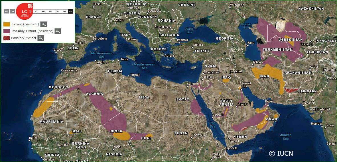 The distribution of the sand cat, as you would imagine, is typically confined to sandy, desert regions and is very unevenly distributed. This makes them difficult to track and therefore to map. Whilst being a desert specialist and capable of inhabiting areas where rainfall is as low as 20mm per year the Sand cat avoids areas dominated by shifting sand dunes that are devoid of any sustainable vegetation.