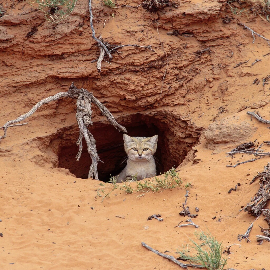 Sand cats are mainly nocturnal and crepuscular animals, avoiding the intense heat of the desert during the day by sheltering in burrows. Unlike most cats who are good climbers or excellent swimmers, this cats skill is the ability to dig, something rare in the cat family. They are also opportunists and if presented with the chance will use burrows dug by other animals such as foxes or porcupines. These dens are often shared by different sand cats but not at the same time. Along with using burrows to protect themselves, they have also been observed hiding leftover food in the sand, coming back to consume it later. You may have a cat at home who will try this, scratching the area near his or her bowl in an attempt to cover their food, maybe this is an instinct left over from their previous, undomesticated days?