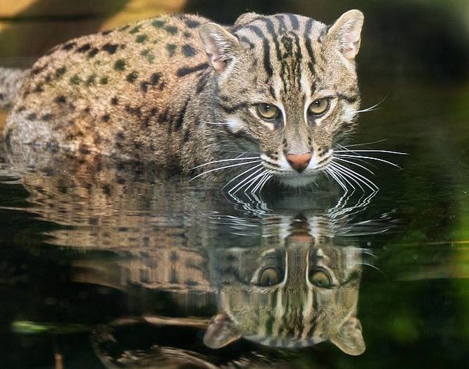 Fishing cats have a very unique way of hunting. Waiting patiently and very still they will sit by the waters edge dipping the tips of their whiskers onto the surface of the water. They have then been witnessed tapping the surface very gently with their claws mimicking insect movement in an attempt to attract a fish. Whilst it’s doing this its whiskers, slightly emerged are processing information allowing them to follow the hydrodynamic trails left by swimming fish, even in murky water!